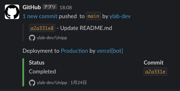 unipp のデプロイは vercel を通して、自動で行われるが、デプロイ後は Slack に URL が送られるため、最終確認として、、目視での確認を行う。