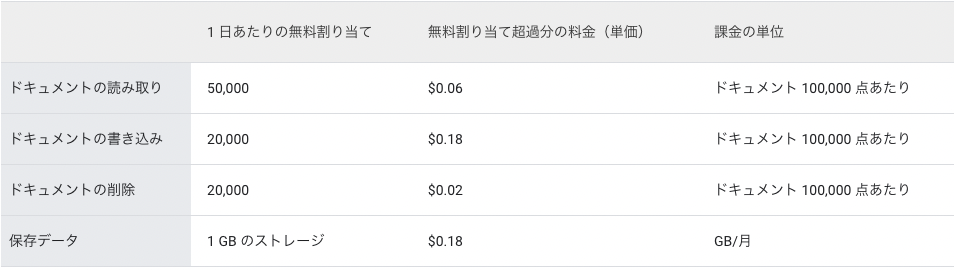 unipp では、バックエンドの機能(認証機能、データベース機能、クラウド実行関数など)は Firebase で実装している。 Firebase は基本的に従量課金制であるが、無料枠が設定されている。そこで、利用しているサービス毎に料金体系をまとめる